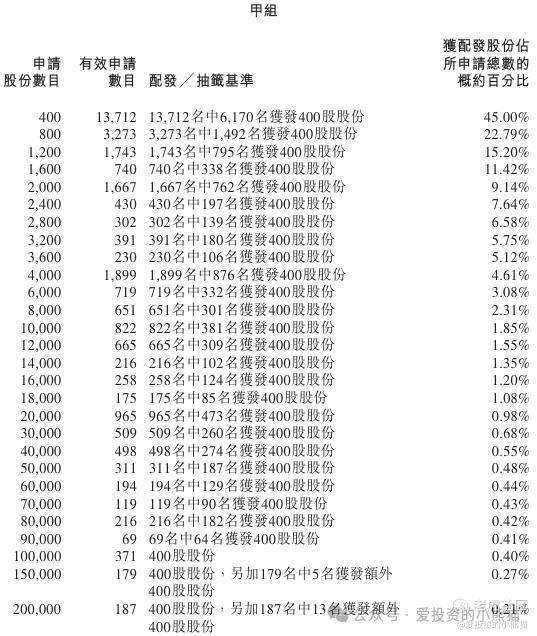 新琪安(02573.HK)乙组官方披露的中签名单里有46人中签4200股,有61人中签4400股,有21人中签5600股,有35人顶头槌认购中签7200股。乙组总共中签83.12万股,货值约1571万港元, 乙头货值约8万,顶头锤货值约13.61万。