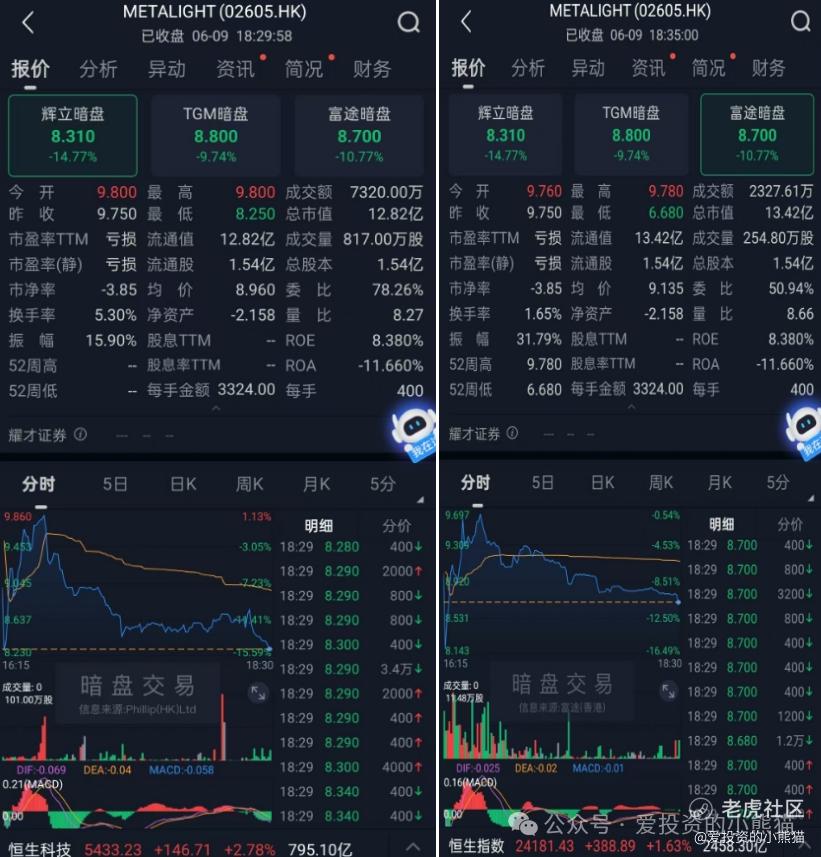 元光科技(02605.HK)辉立暗盘以最高点9.80港元高开,立马回落最低点8.23港元后,又瞬间上冲到最高点9.80港元,之后大幅回落,尾盘以8.31港元报收,跌幅为14.77%,振幅15.90%,成交7320万港元。