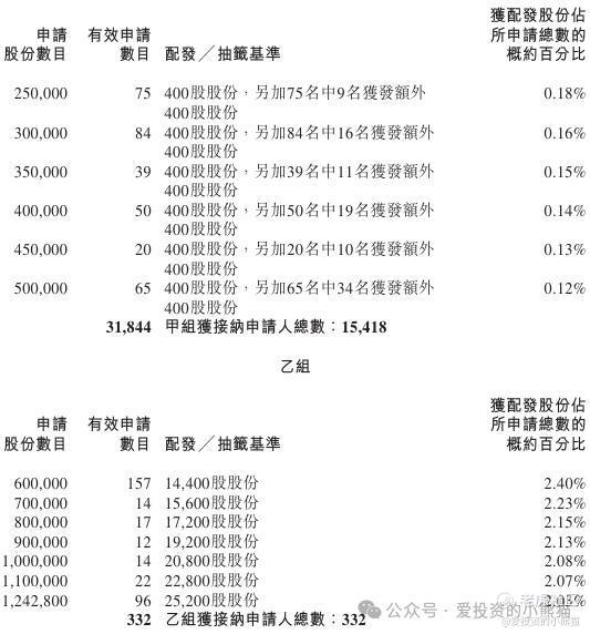 公开发售情况:21482人认购,这次公配149.37倍,由于超过100倍,回拨比率15.70%(按理说应该是50.00%),套路回拨了,国配有0.93倍,一手中签率10.00%,认购600手才必中1手,同时乙组163人申购,其中顶头槌申购35张,获配率1.36%-1.44%,