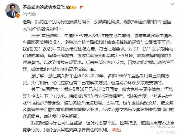 6月8日,比亚迪集团品牌及公关处总经理李云飞发布微博长文,直面近期“常压油箱”和“车圈恒大”两大争议。