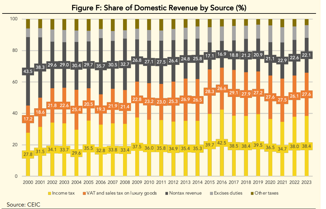 上上图中那个Postur Makro Fiskal说的是财政情况,可以看到在普拉博沃总统的计划里面,赤字率基本还是保持稳定,也就是最下面那个Pembiayaan。所以他其实提议了加税。其实也说不上是提议,这应该是印尼之前一系列财政计划中的一部分,印尼的税收一直是一个巨大的问题,他们不想有太多的赤字(这其实也是一个可以展开很多的话题,印尼大学经济学院是一个水平高于名气的学院),所以必须收税。
