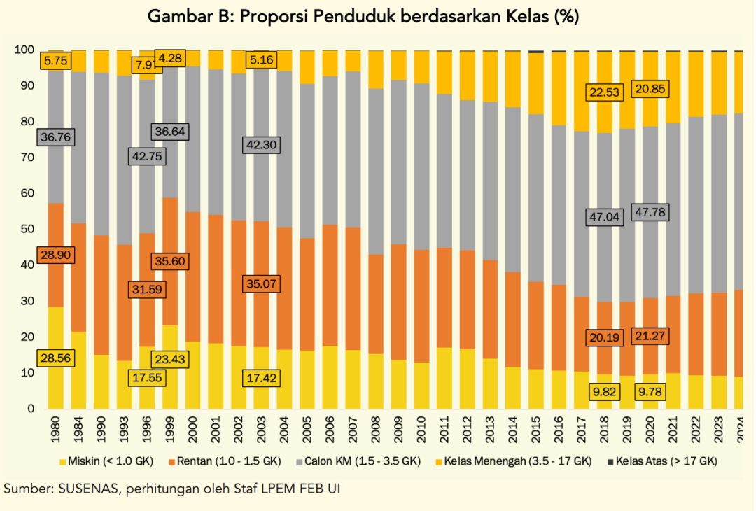 从下到上,分别是收入在0-20分位,20-40分位逐一类推的群体比重。可以看到印尼民主化改革20多年依赖,最赤贫的阶级在逐渐减少,这是这个改革能够成功并且维持的最根本原因,而最高收入的群体,虽然在2018年后有所收敛,但整体比2000年扩大了很多。这是这个改革能够成功并且能够维持的次根本原因。