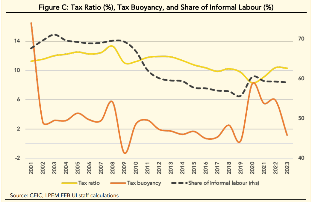 而非税收入则和油价息息相关。所以过去印尼的发展就陷入了一个结。油价低了就有问题需要贬值货币,贬值货币带来投资环境不稳定,没人投资导致产业单一,对油价依赖更高。而在另一条平行的线条。这种单一的产业,导致很多就业是非常态就业,或者叫做Informal Labour,这带来了更多的税收困难。