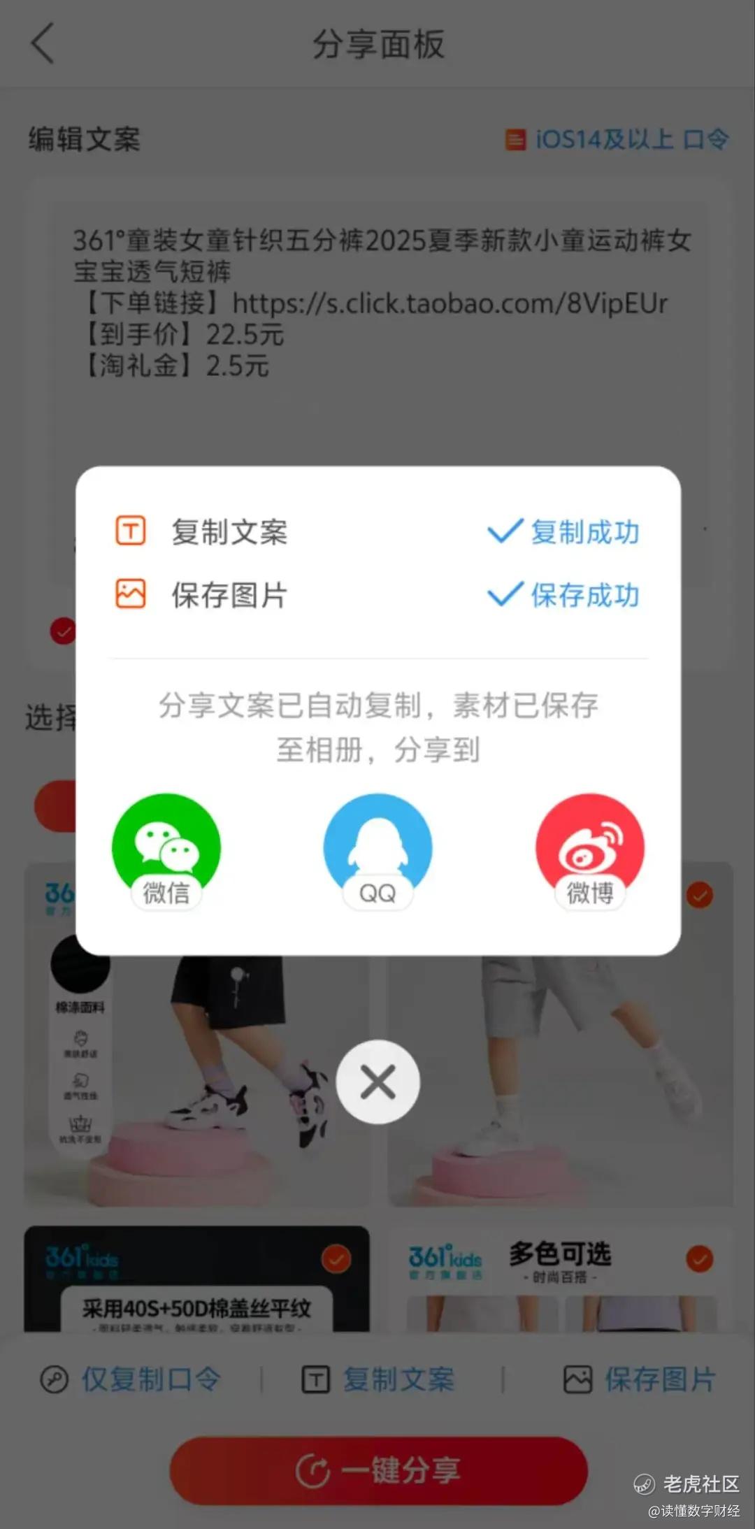 推广模式以文案链接为主,可配以图片进行分享,以上推广操作均由AI完成。以某童装短裤商品为例,选定推广商品后,再点击“分享赚”,会自动配备推广的文案和图片素材,商品到手价22.5元,佣金3.38元,最后点击“一键分享”,可分享至微信、QQ和微博。