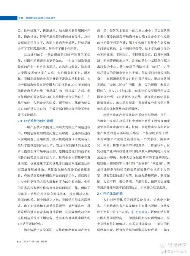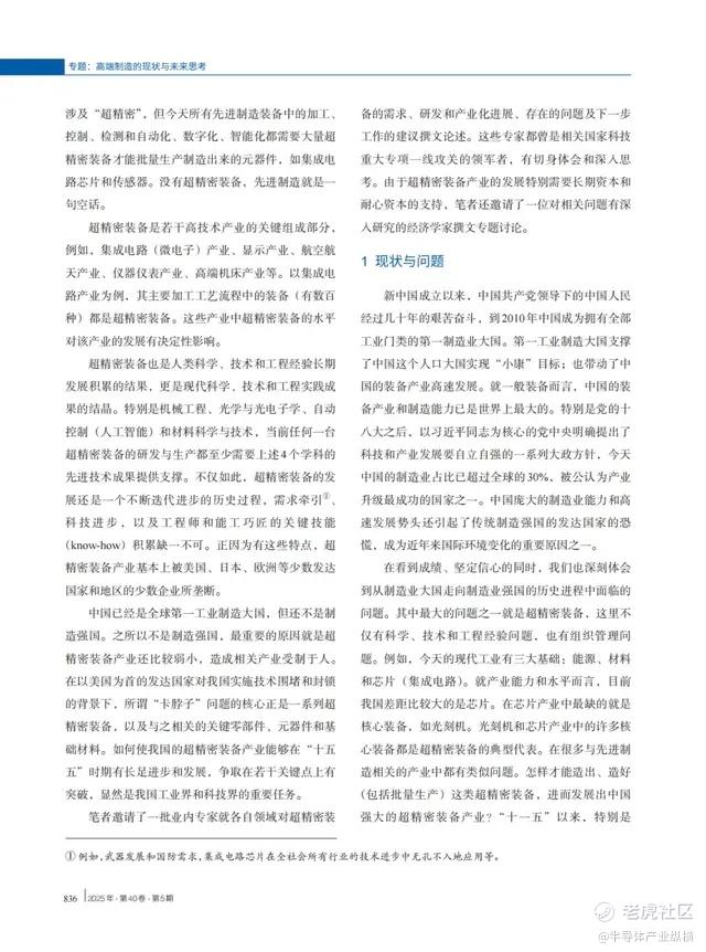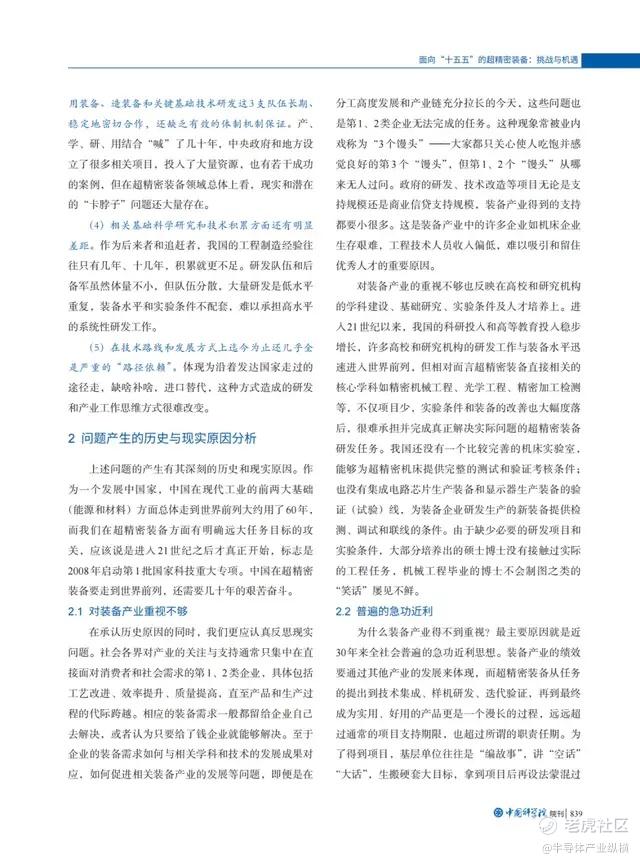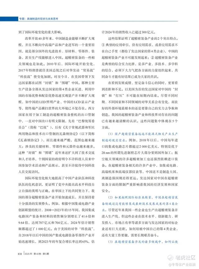 精密装备通常指加工工艺中精度达到微米级的装备,超精密装备通常需要达到微米级甚至纳米级以上。超精密装备是今天先进制造的基础,同时也是若干高技术产业的关键组成部分,如集成电路、显示、航空航天、仪器仪表、高端机床等。这些产业中超精密装备的水平对该产业的发展水平有决定性影响。超精密装备还是现代科学、技术和工程实践成果的结晶,其发展是一个不断迭代进步的历史过程,需求牵引、科技进步和工程师的关键技能(know-how)积累缺一不可。时至今日,超精密装备产业基本被发达国家的少数企业垄断。超精密装备产业比较薄弱,也是中国作为全球第一制造业大国但还不是制造强国的重要原因之一。文章分析了当前我国超精密装备产业发展的现状和存在的主要问题,以及这些问题产生的原因。面对剧烈变化的内外环境,提出了抓住机遇、迎接挑战的具体工作建议。