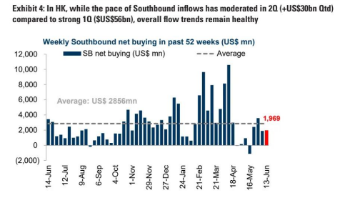 高盛新兴市场每周资金流向监测到,上周(6月9-13日当周)出现由中国台湾省 / 韩国引领的强劲外资买入。在香港市场,尽管南向通资金流入速度在第二季度(按季度计算流入 30 亿美元 )相较于强劲的第一季度(560 亿美元 )有所放缓,但整体资金流向趋势仍保持健康。