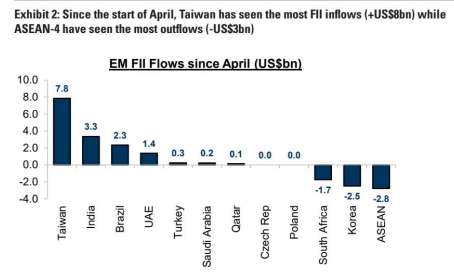 图 2:自 4 月初以来,中国台湾省录得最多的外国机构投资者(FII)资金流入(+80 亿美元),而东盟四国则录得最多的资金流出(-30 亿美元 )