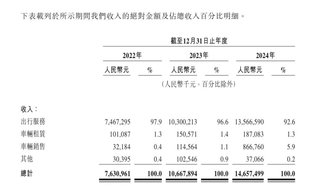 公司收入来源是出行服务,2024年营收占比92.6%,包括经济型“惠选”和高端“专车”;其次是车辆销售与租赁,营收占比5.9%,主要向合作方销售定制车;其他业务广告等占比约1.5%。