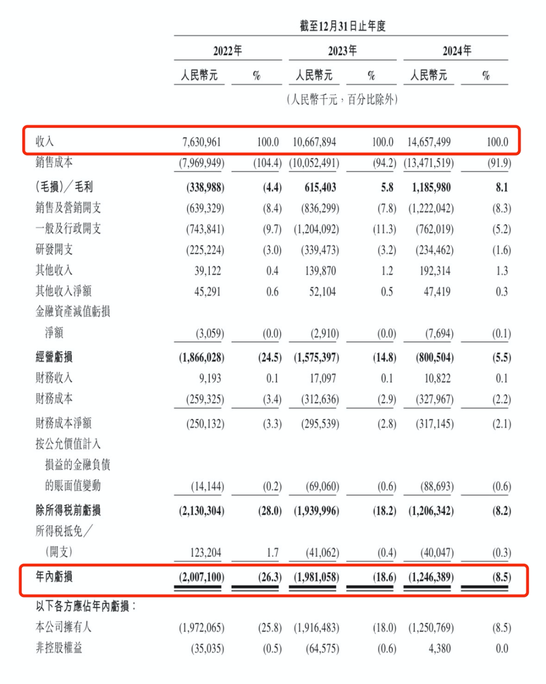 财务数据显示:在过去的2022年~2024年,曹操出行的营业收入分别为人民币76.31亿、106.68亿和146.57亿元,相应的净亏损分别为人民币20.07亿、19.81亿和12.46亿元,三年亏损超52亿。