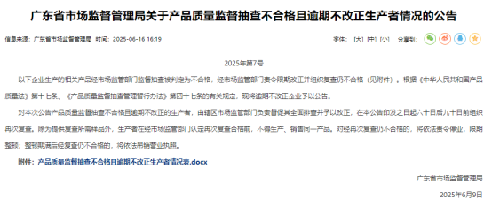 此外,广东市监局要求对本次公告产品质量监督抽查不合格且逾期不改正的生产者,由辖区市场监管部门负责督促其全面排查并予以改正,在本公告印发之日起六十日后九十日前组织再次复查。除为提供复查所需样品外,生产者在经市场监管部门认定再次复查合格前,不得生产、销售同一产品。对经再次复查仍不合格的,将依法责令停业,限期整顿;整顿期满后经复查仍不合格的,将依法吊销营业执照。