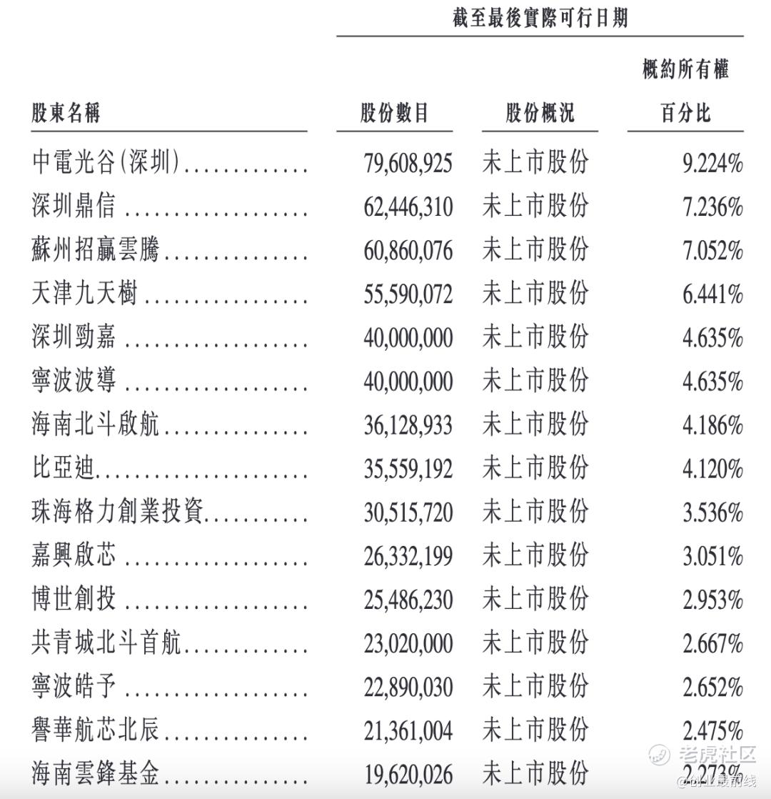 但该公司目前并没有控股股东,上市前,中电光谷(深圳)持股9.224%、招银国际通过苏州招赢云腾持股7.052%、深圳鼎信持股7.236%、CPE源峰通过天津九天树和杭州泓聿合计持股8.336%、宁波波导持股4.635%、比亚迪与其员工跟投平台嘉兴创启开盈合计持股4.168%等。