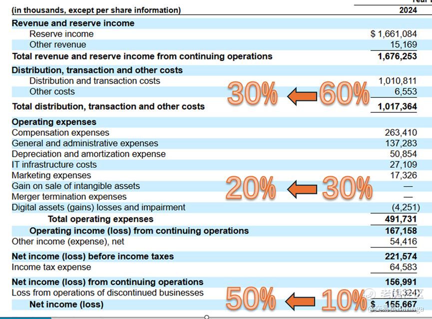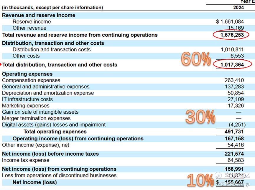而支出方面,分销费用占大头,相对总营收的占比大概有60%,其他的运营费用占总营收的比例大概是30%,这就导致了2024年circle的净利润只有15.67亿美元,占总营收的占比不到10%。