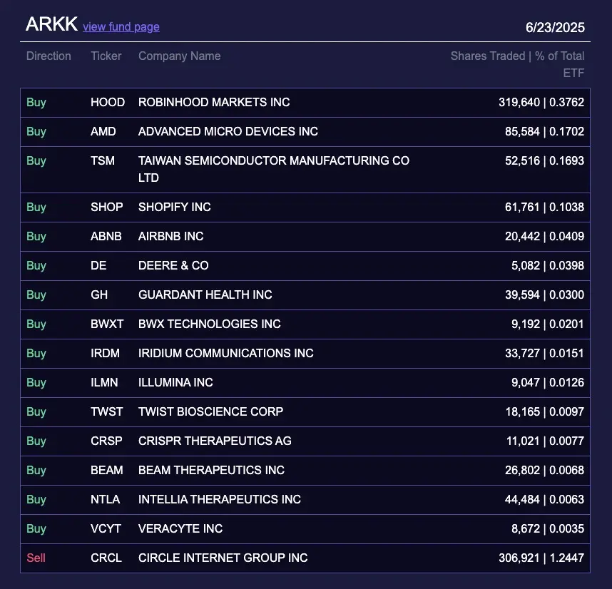 $台积电(TSM)$ 木头姐旗下ARK基金减持$Circle Internet Corp.(CRCL)$ 30.6万股,转头猛加仓$Robinhood(HOOD)$ 、$美国超微公司(AMD)$ 和$台积电(TSM)$ ,这波操作堪称韭菜收割机典范。