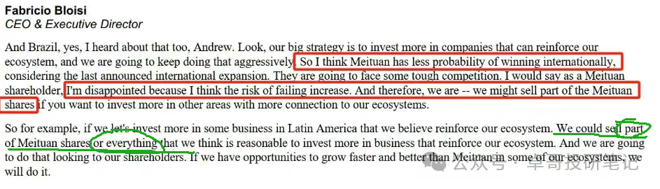 Prosus的新CEO认为美团进军国际市场赢面不大,作为美团股东,他挺失望。并说,如果看到更有吸引力的业务,会卖出部分或全部的美团股份