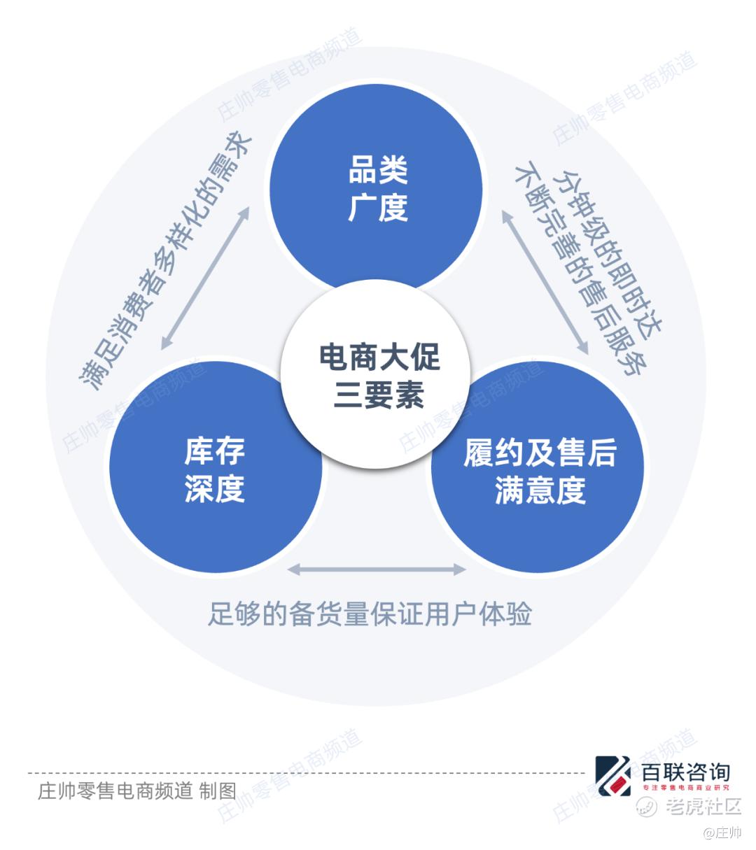 根据「庄帅零售电商频道」在零售电商行业多年的实践和研究,发现想要组织和开展618、双11的电商大促,平台必须具备三大核心要素:品类广度、库存深度、履约及售后满意度。