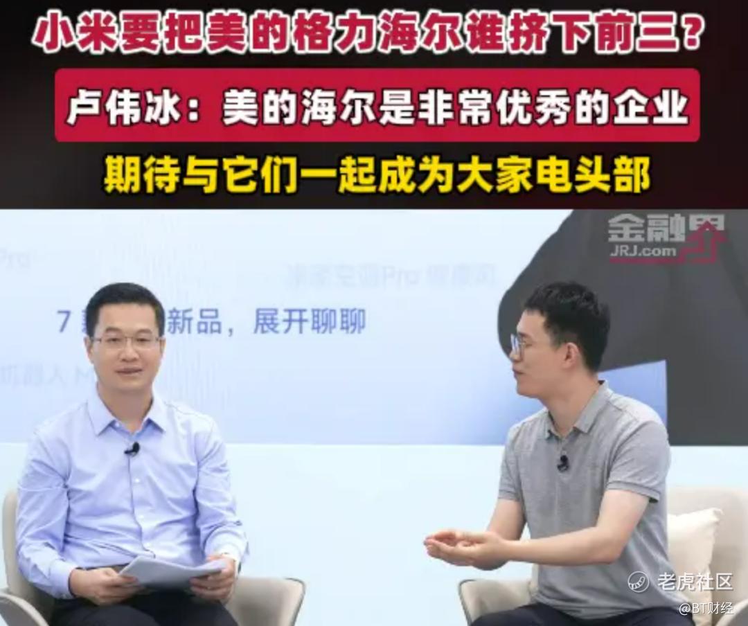 6月18日晚间的“卢伟冰直播聊小米新品”活动中,小米集团合伙人、总裁、手机部总裁、小米品牌总经理卢伟冰回应了美的董事长方洪波此前所提及的“小米大家电三年之内成为中国头部(前三)”这一问题。卢伟冰表示,他带队拜访了美的、海尔,并表示交流下来发现两家企业都非常优秀、产业非常扎实、企业文化也非常好,无论是方总还是周总都是极其有格局的企业家,值得小米学习。卢伟冰直言,期待将来有机会和海尔、美的一起成为头部企业,推动行业发展。