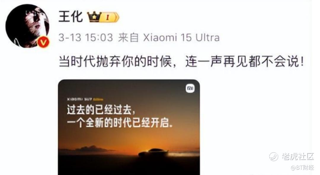 雷军对此事没有回应,但当晚小米公关总经理王化在微博发文表示“当时代抛弃你的时候,连一声再见都不会说!”,该文配图是一张小米SU7的海报,图片中“过去的已经过去,一个全新的时代已经开启”的大字像是最有力的回应。