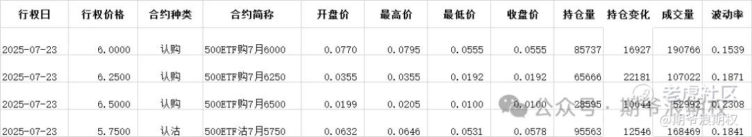 (2)上证500ETF期权:7月最大持仓范围5500-6000,今收5.888,下跌0.42%,期权7月主力合约,认购认沽都以增仓为主,认购集中在5750-6750之间,合计6.0W张;而认沽集中在5250-5750之间,合计2.8W张。增仓超过1W张的仓位具体如下: