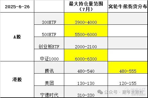 继续今天的复盘,下图是今天大A的3个ETF和一个指数,以及港股的腾讯、美团和宁德时代的最大持仓量范围以及窝轮牛熊分布范围,也就是7月的资金筹码分布,黄色的表示跟上个交易日有变动。