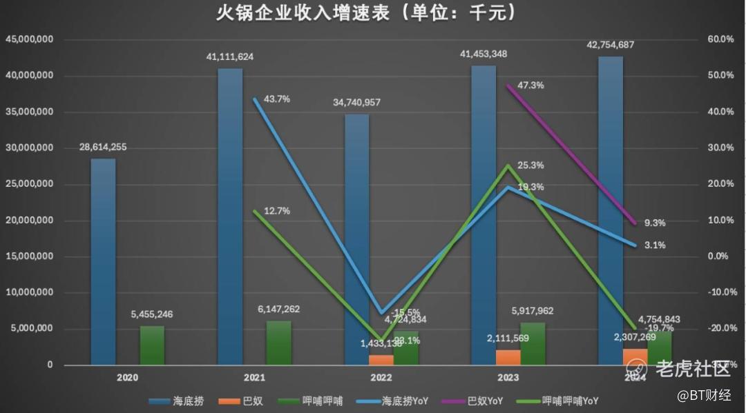 按2024年收入计算,巴奴在中国火锅市场中位列第三名,居于海底捞和呷哺之后,但其实际市场份额仅为0.4%,远低于海底捞的5.4%和呷哺的1.8%,海底捞的市场份额约为巴奴的14倍(以收入占比计算),这也和火锅行业高度分散的竞争格局有关,前五大品牌的合计份额仅为8.1%,