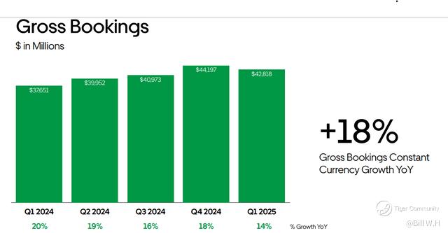 尽管受国际市场出行订单增长较快导致的价格组合(price mix)略显不利,导致总预定量和营收增速略低于出行量增速,但强劲的利润率改善充分证明了公司在成本控制和运营效率上的卓越表现。本季度调整后EPS由去年同期的亏损0.31大幅转为盈利0.83,远超市场预期的$0.33。