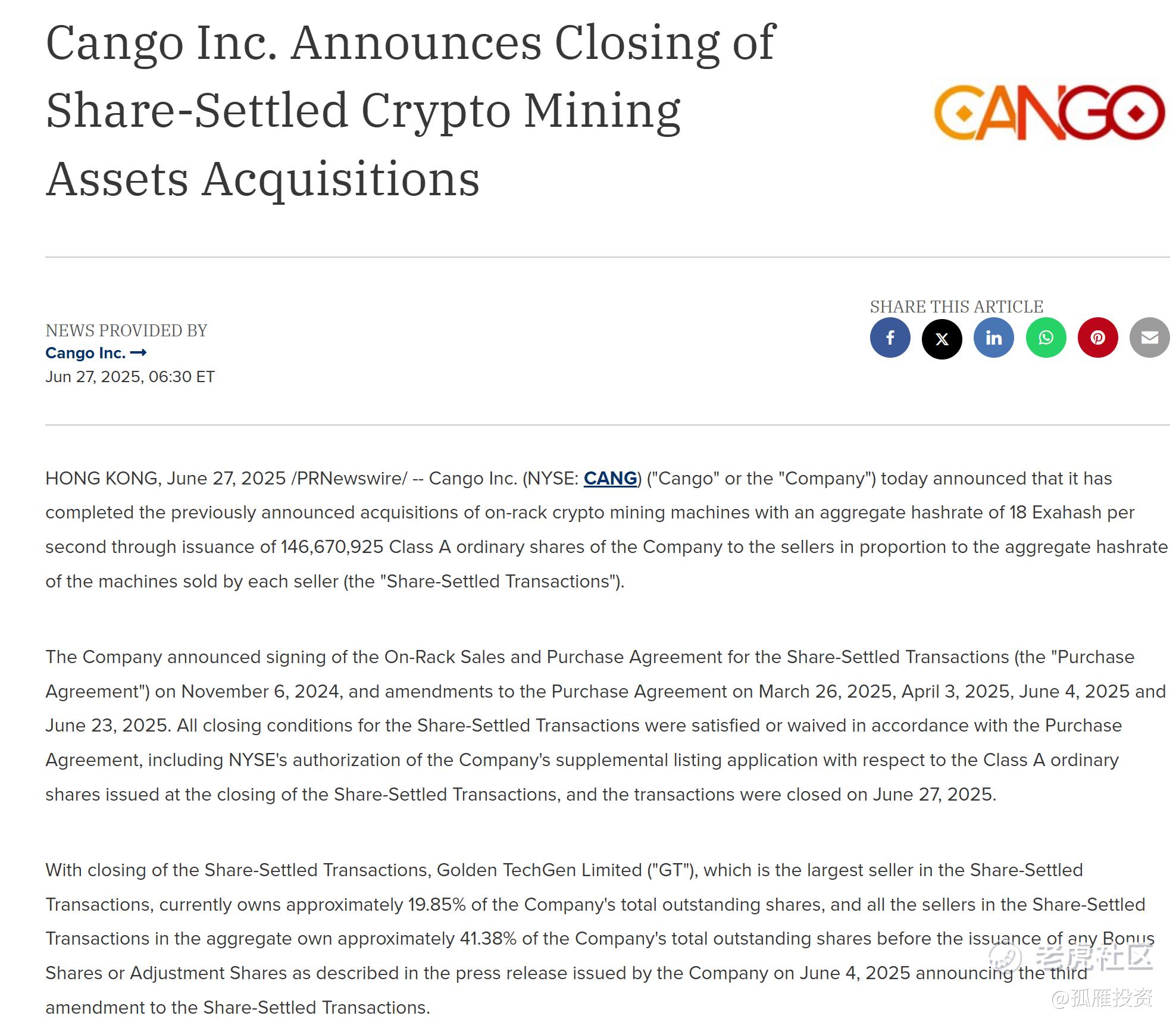 $灿谷(CANG)$ 灿谷又收购了18EH/S的算力,目前运行算力正式达到50EH/S,尘埃落地,产出效率进一步提升!彻底进军成为这一行业的巨头了。 我个人预判,后续灿谷应该不会满足与此,这个行业头部的都在持续融资扩张,甚至像川普自己的公司,软银这些巨头都开始干这个了。 还是那句话,囤的越多,后面的收益越大!