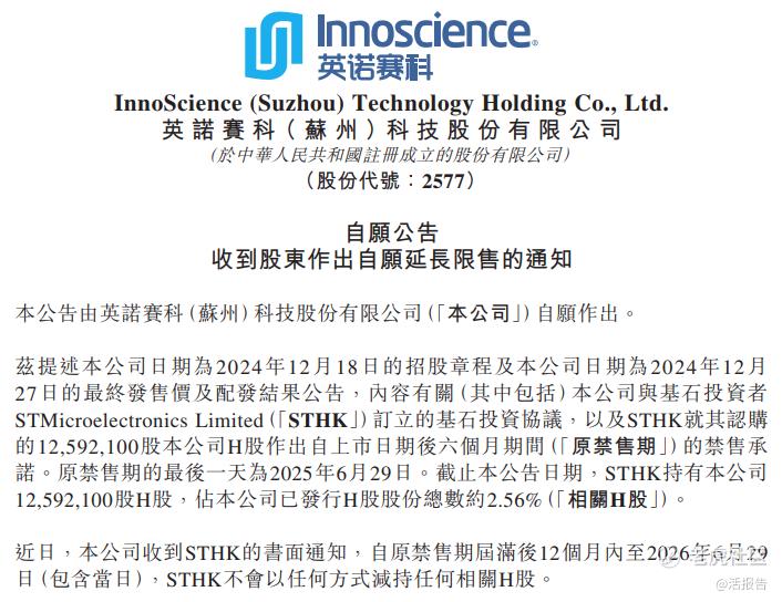 6月30日,氮化镓半导体龙头企业英诺赛科(2577.HK)发布公告,公司最大基石投资者意法半导体(STM.US)将所持股份自愿延长禁售期12个月,自原禁售期届满后12个月内不以任何方式减持任何股份。