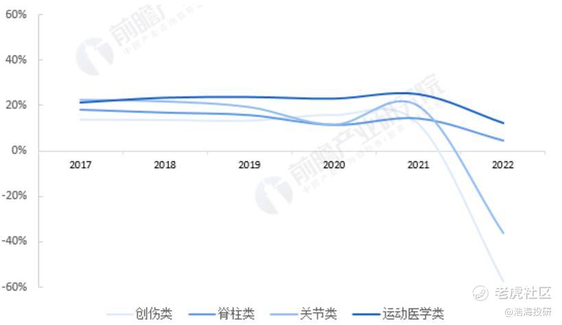 2017-2022年中国骨科植入器械主要产品市场增速(单位:%) 来源:《中国医疗器械蓝皮书》前瞻产业研究院