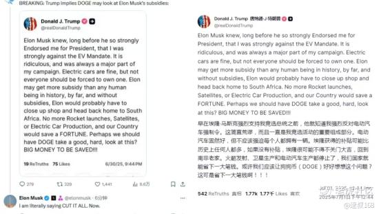 马斯克这次不留情面,直接在社交平台炮轰共和党推的“大而美”法案,说这法案是“疯狂烧钱”“毁掉未来”。结果川普也不客气,反击说马斯克如果没有政府补贴,早就回南非当老板了,还讽刺他吃了太多政府补贴,甚至建议有关部门彻查特斯拉的补助来源。马斯克转头就立马回应:“全部削减,就现在!”