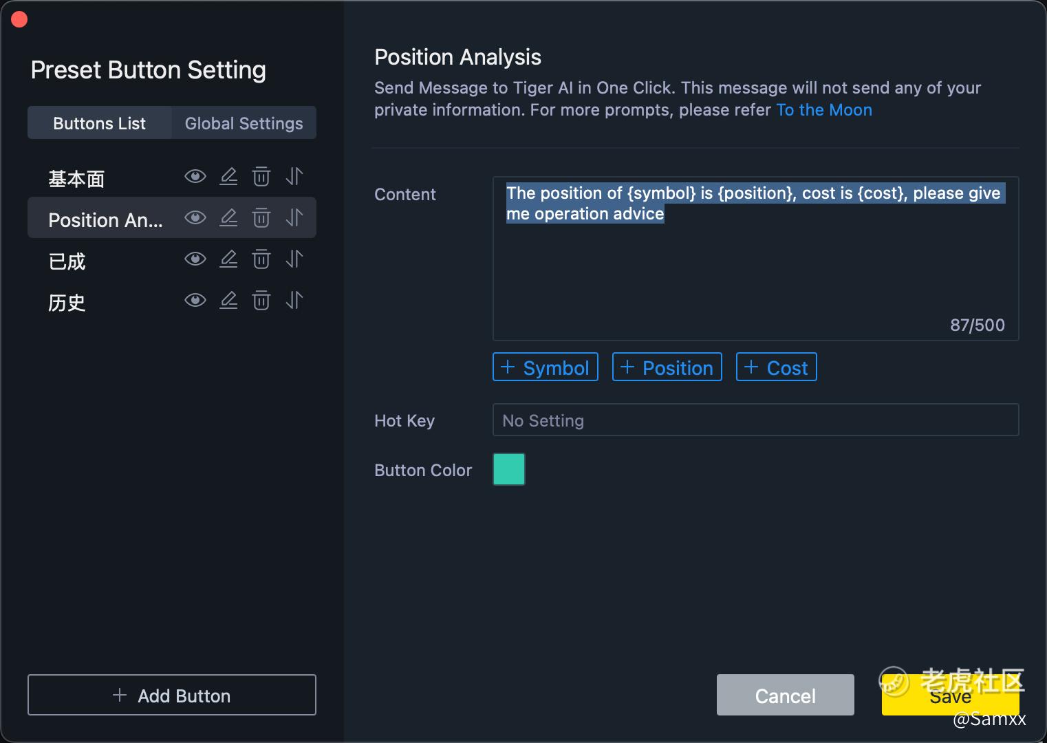 PC端已经能提前设置好问题的模板,点击一键提问 AI 了。还能获取当前客户端中的股票和其持仓&成本 我{symbol}的持仓是{position},成本价{cost},请给我调仓建议 对于基金也可以试试: {symbol}的底层逻辑和交易策略分析,并根据公开的持仓变动信息,给基金经理的最近一年的操作进行打分