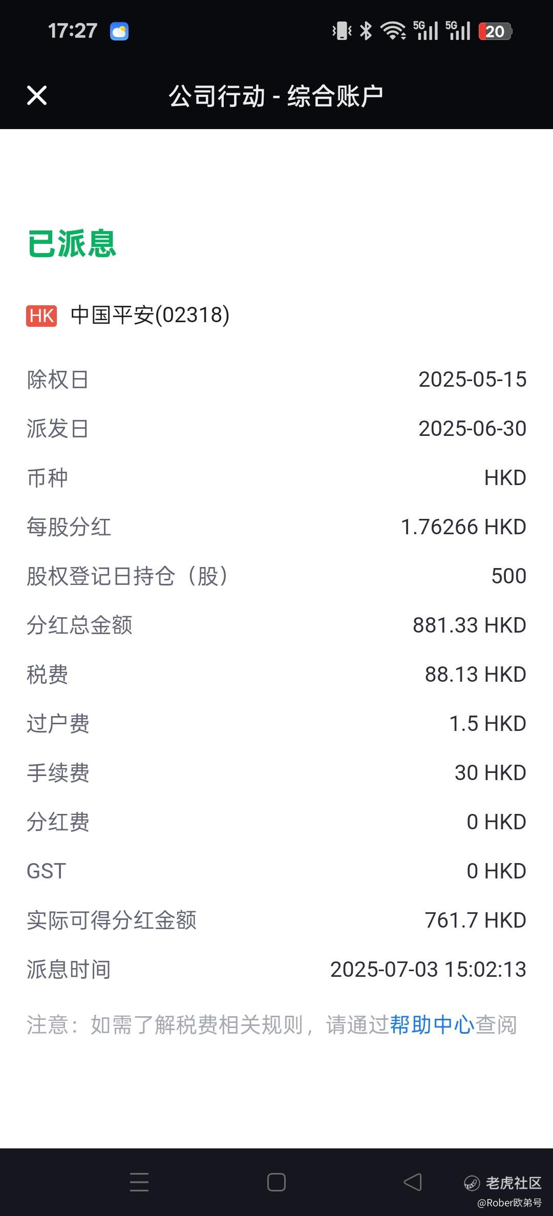 分红效率真慢,竟然比港股通还晚一天到账,分个红还扣这么多费用,怪不得港岛金融搞的越来越没落了,再过二十年也许不用,可能被渔村深圳远远抛在脚后了。。。。