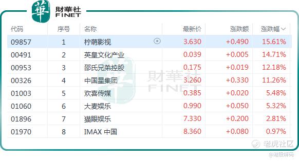 7月9日,港股影视板块延续近期涨势。成分股中, $柠萌影视(09857)$ 大涨15.61%, $邵氏兄弟控股(00953)$ 涨12.18%, $中国星集团(00326)$ 涨11.26%, $中国儒意(00136)$ 涨7.14%, $欢喜传媒(01003)$ 涨5.48%,猫眼娱乐(01896.HK)涨2.81%。
