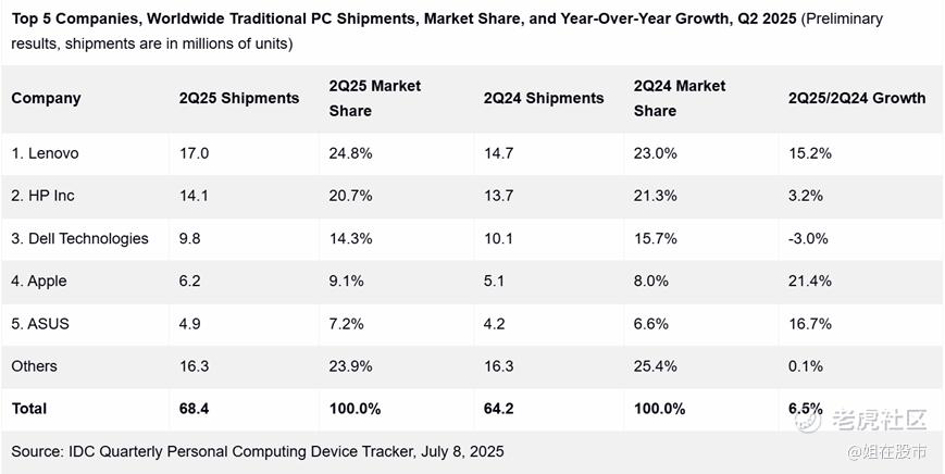 7月9日,根据国际数据公司(IDC)的最新一期的全球个人计算设备季度跟踪数据(初步结果),2025年第二季度的PC(个人计算机)出货量同比增长6.5%,全球出货量达到6840万台。