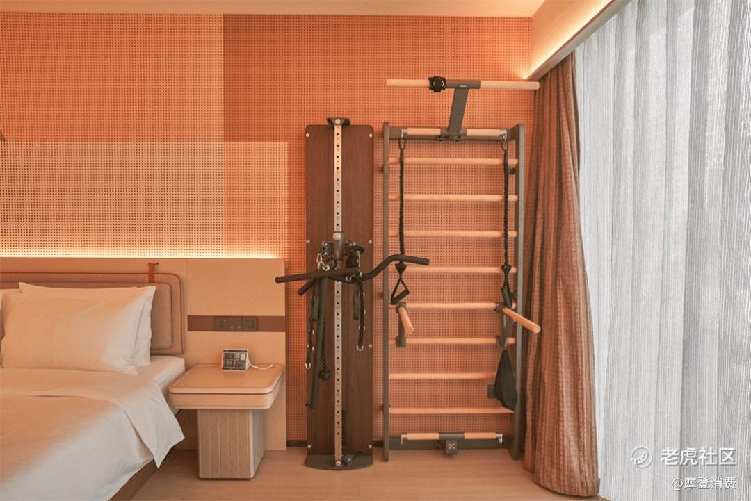 比如桔子酒店和乐刻运动联合打造桔子杭州拱墅宝龙广场乐刻酒店,主题客房专门装配了“六边形战士”型专业运动器械、酒店健身房就是设施专业的乐刻健身房,方便旅客出差时继续自己的健身计划。