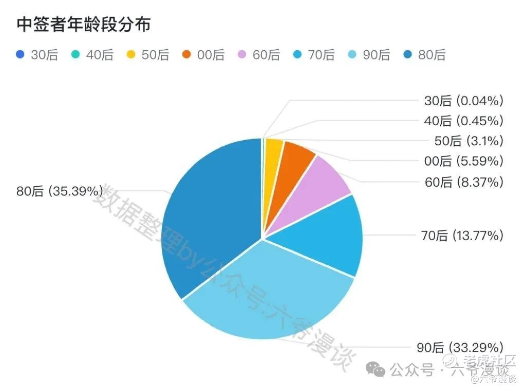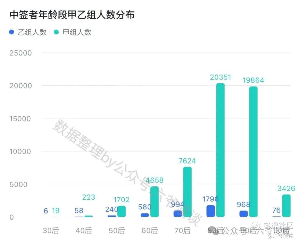 参与乙组人数最多的还是80后,虽然90和80后中签人数参不多,但是90后乙组人数(968)却只比80后(1796)乙组人数的一半多一点点而已。