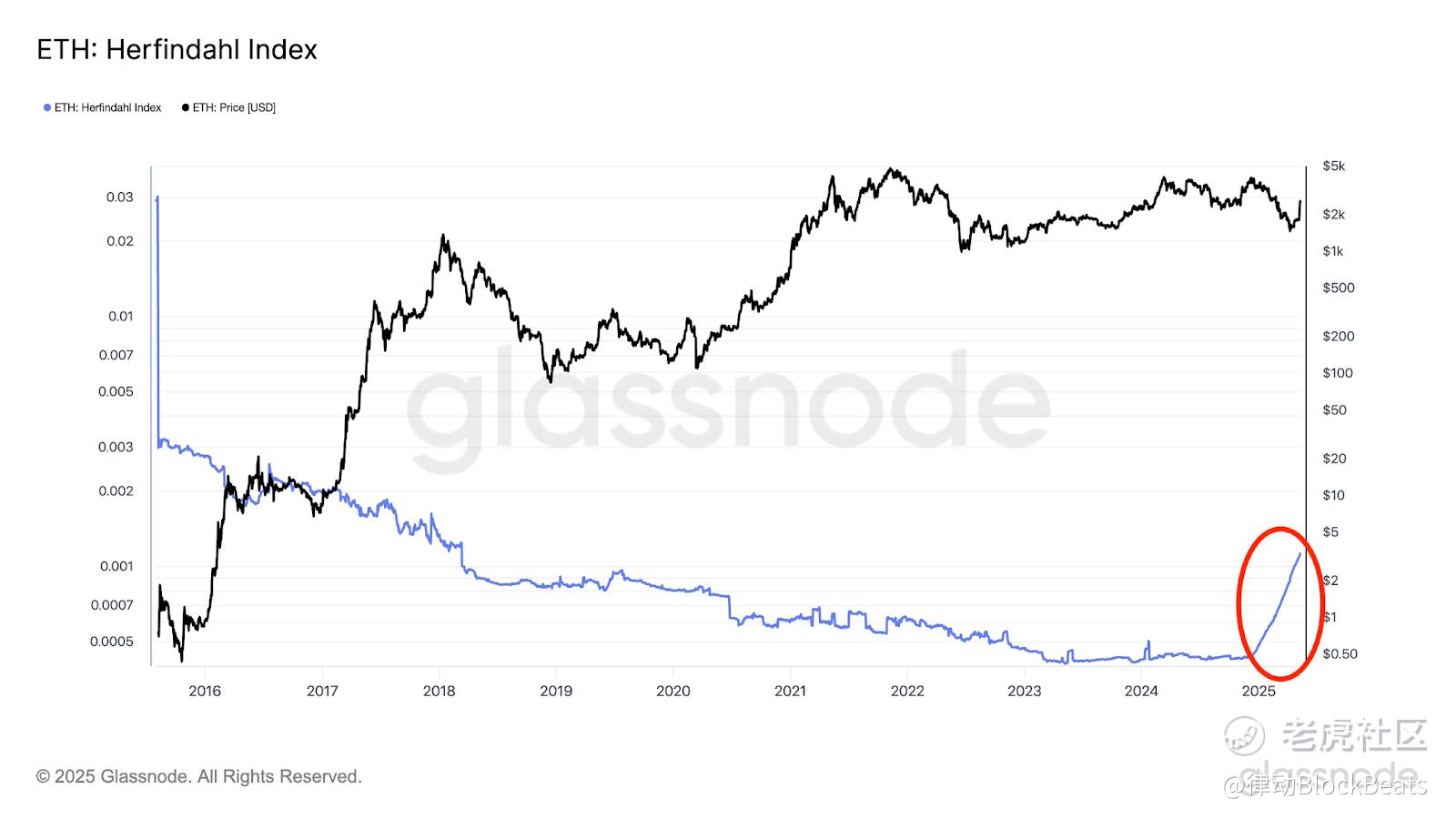 然而链上的数据,却早有预兆——2024 年 12 月至 2025 年 4 月,是以太坊价格自由落体的阶段,但也是赫芬达尔-赫希曼指数(HHI)悄然拐头向上的时刻。