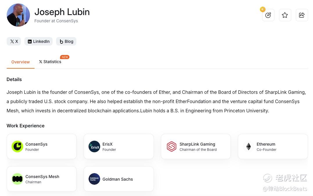 Joseph Lubin 本人不仅持有大量以太坊,还在投资 SharpLink 后,成为其董事会主席,持有 SBET 9.9% 的股份,成为其公开最大个人股东。