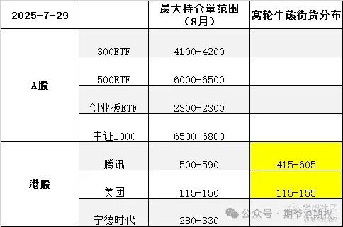 下图是今天大A的3个ETF和一个指数,以及港股的腾讯、美团和宁德时代的最大持仓量范围以及窝轮牛熊分布范围,也就是8月的资金筹码分布,黄色的表示跟上个交易日有变动。