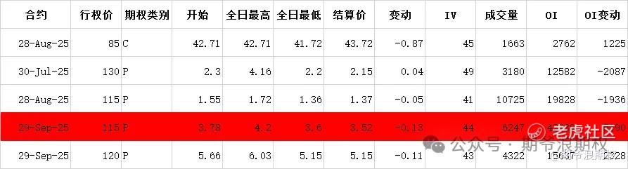 (2)美团:8月最大持仓范围115-150,窝轮牛熊街货分布115-155,今收128.6,下跌0.62%,期权盘路变化超过1000张的仓位如下图,红色是增仓较多的仓位,9月115沽增仓5000多张。总体主要是7月和8月认沽减仓,并移仓到9月。