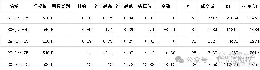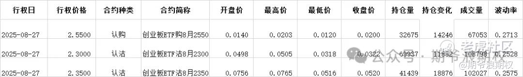 (3)创业板ETF期权:8月最大持仓范围2300-2300,今收2.383,上涨1.75%,期权8月主力合约,认购是低行权价减仓高行权价增仓,减仓很少,增仓集中在2400-2550之间,合计3.0W张,而认沽几乎全是增仓,主要集中在2150-2400,合计5.3W张。下图是增仓超过1W张的仓位: