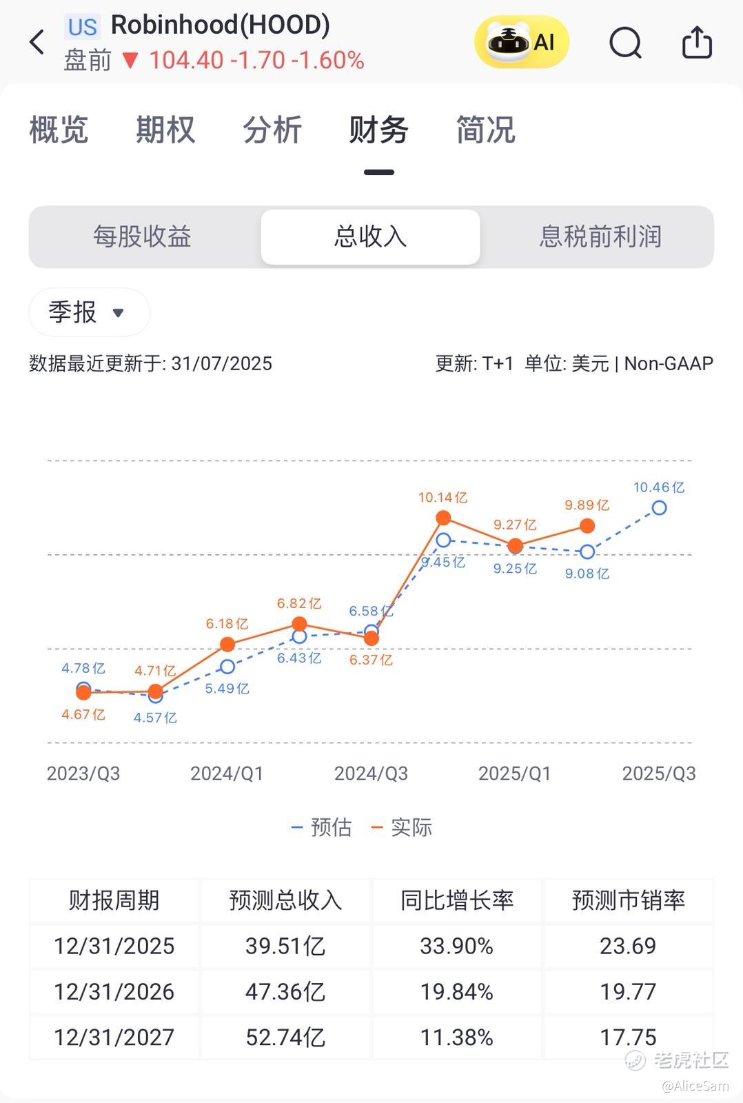 别的不说,远的不谈,单单说这次的财报,Robinhood在2025年第二季度交出了一份亮眼的成绩单,他们的总营收达 9.89亿美元,同比增长 45%,远超市场预期的9.08亿美元。他们下个季度的预期,也是高高在上的样子,如果能达标,那稳步上升的趋势就基本成型了。