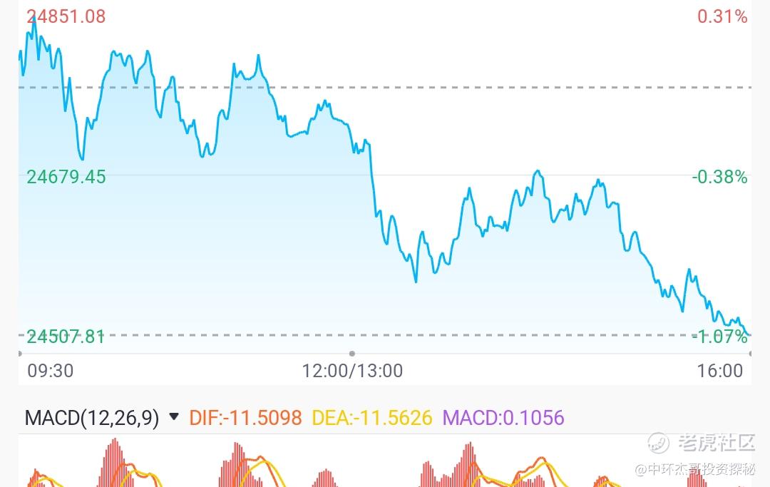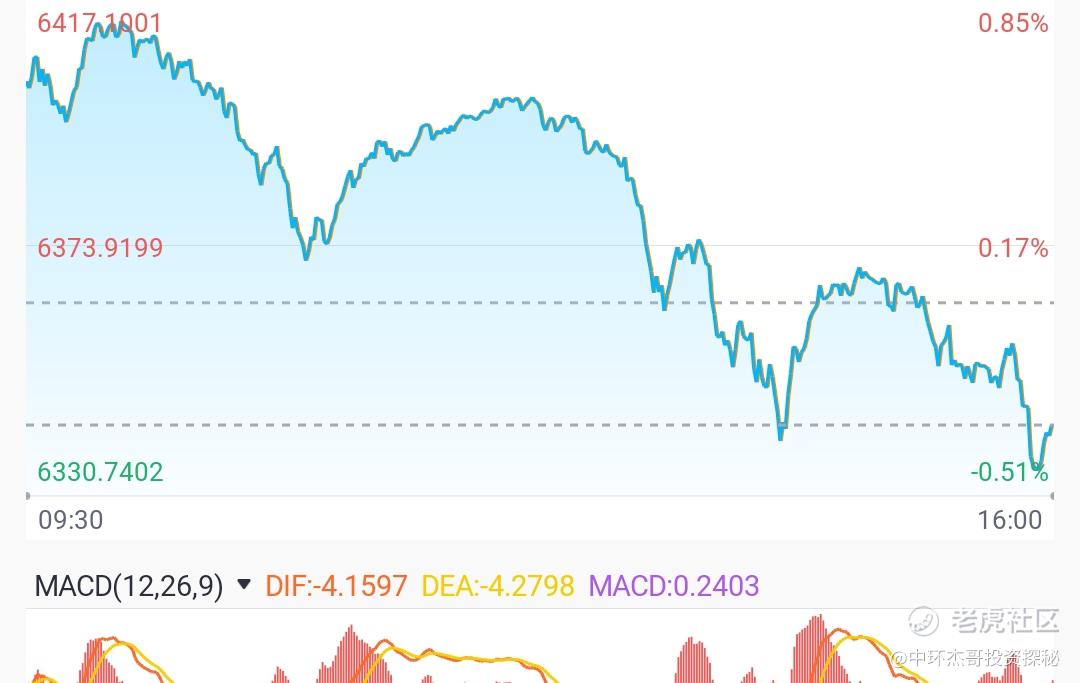 正式开盘后,虽然还是高开,并且有过短时的上冲,最后高开低走,几乎最低收盘,虽是小跌收盘,但是,盘中分时已算是1%左右的下跌了。