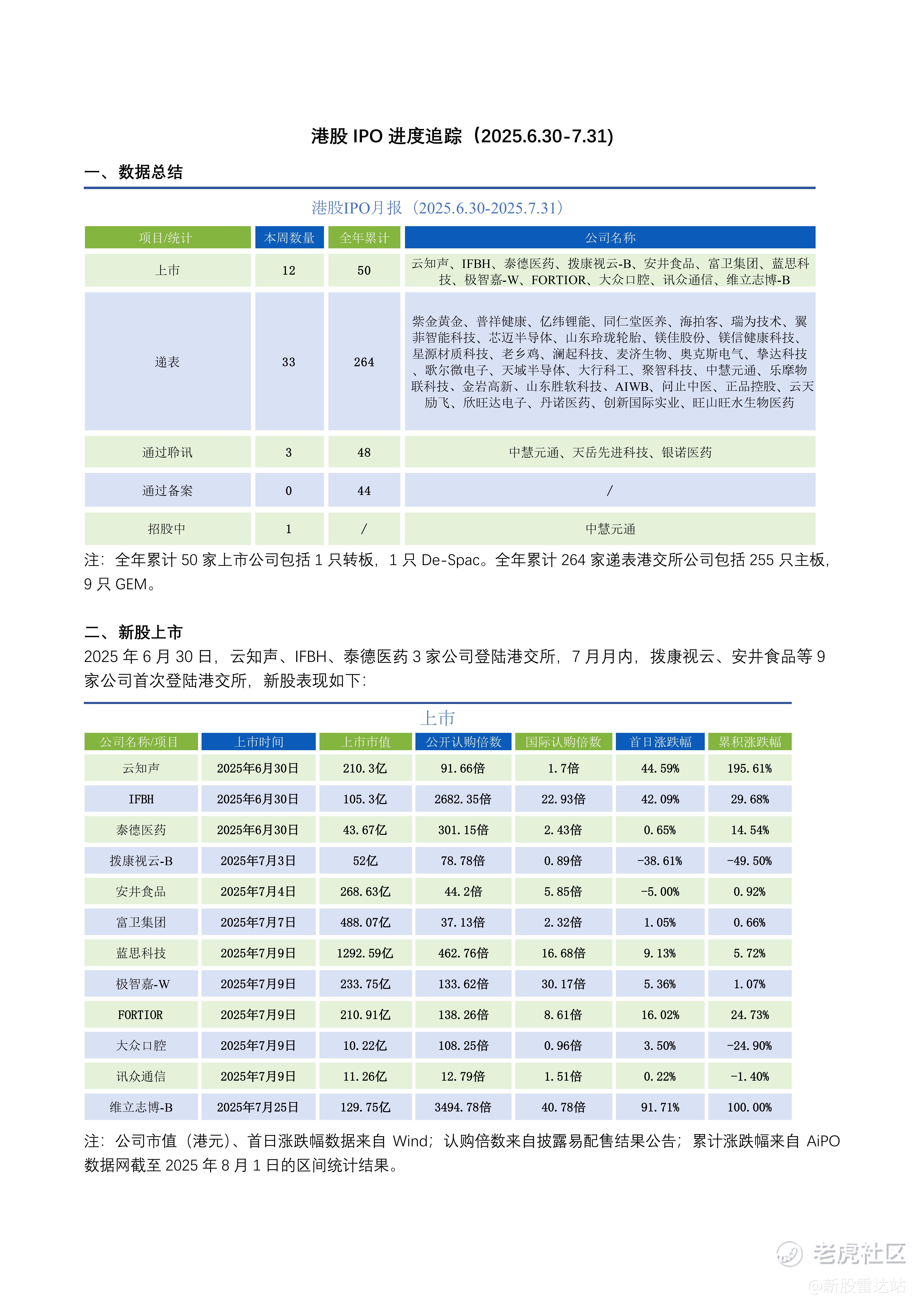全年累计 50 家上市公司包括 1 只转板,1 只 De-Spac。全年累计 264 家递表港交所公司包括 255 只主板, 9 只 GEM。