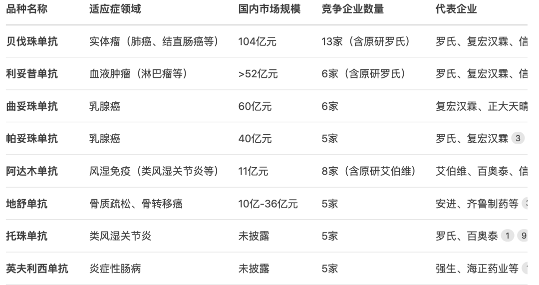 从销售额来看,贝伐珠单抗最大,2024年终端104亿元销售额,有13家企业竞争;曲妥珠单抗销售额达60亿元;利妥昔单抗52亿元、帕妥珠单抗40亿元、阿达木单抗11亿元、地舒单抗11.8亿元、英夫利昔单抗11.3亿元、托珠单抗5亿元。