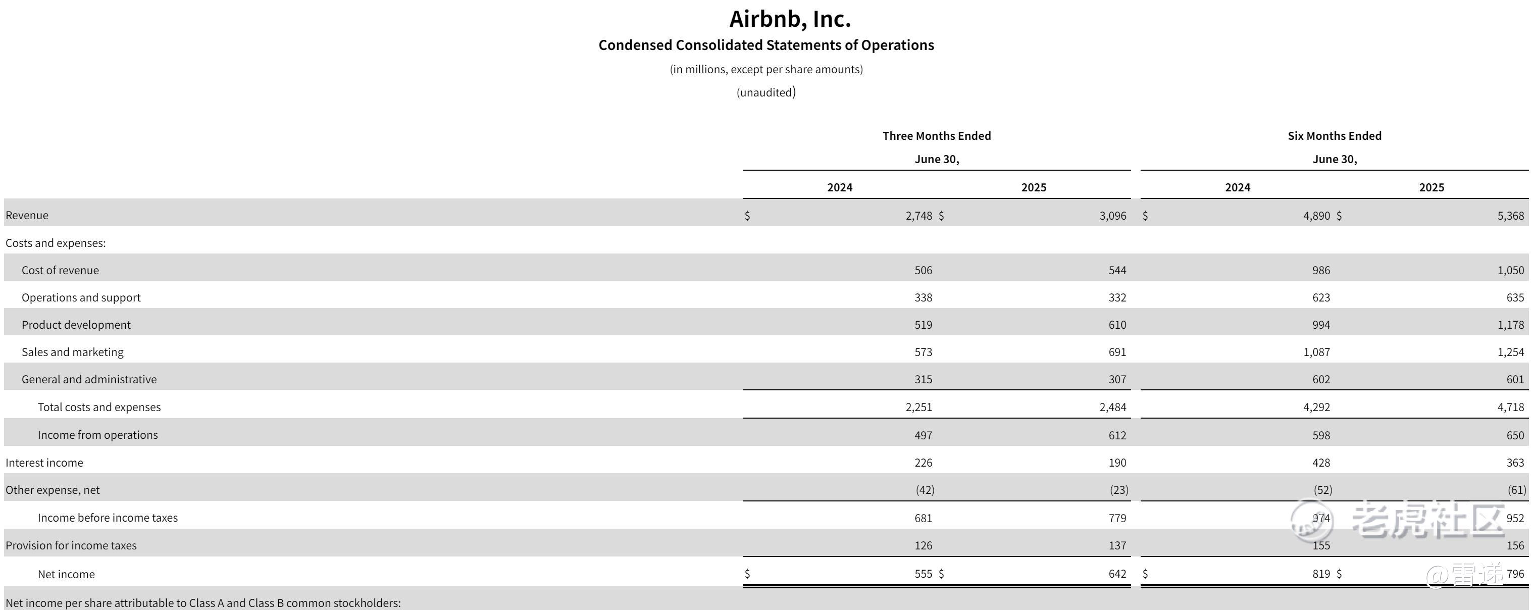 Airbnb在2025年上半年运营利润为6.5亿美元,较上年同期的5.98亿美元增长8.7%;净利为7.96亿美元,较上年同期的8.19亿美元下降2.8%。