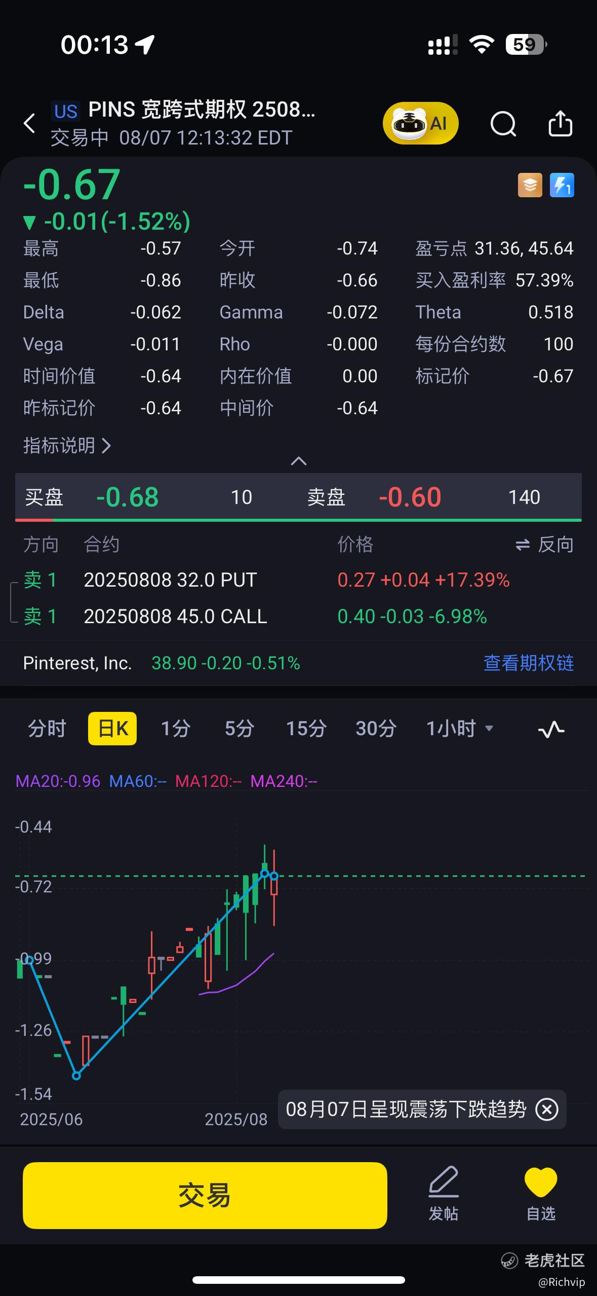 $Pinterest, Inc. STRANGLE 250808 PUT 32.0/CALL 45.0$ 美版“小红书”财报策略开仓