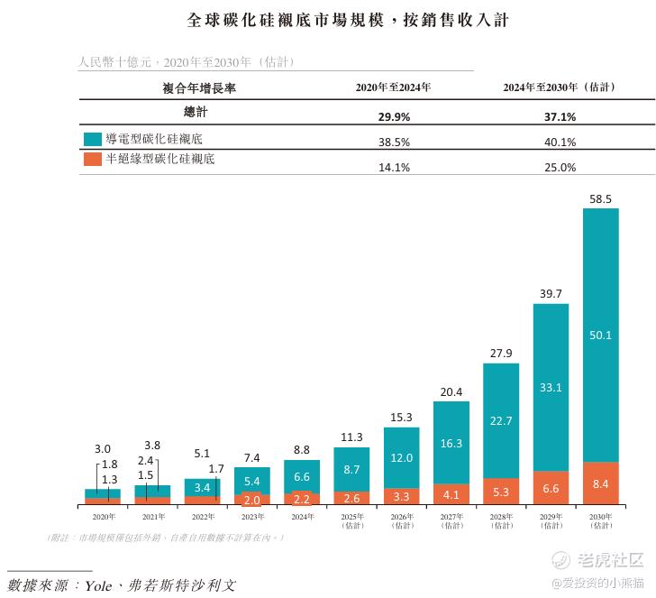 根据弗若斯特沙利文的资料,以销售收入计,全球碳化硅衬底市场由2020年的人民币30亿元增长至2024年的人民币88亿元,复合年增长率为29.9%。预计到2030年,市场规模将有望增长至人民币585亿元,复合年增长率为37.1%。