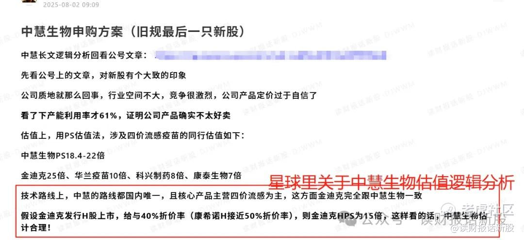 他们直接拿中慧跟只涉及一点裂变疫苗的标的做对比,比如华兰疫苗、科兴制药等做对比,从而得出中慧生物估值高估