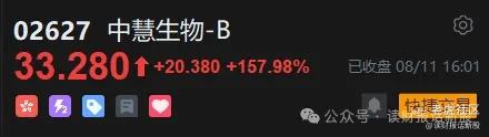 旧规最后一只新股,中慧生物 $中慧生物-B(02627)$ 今天首日收盘涨158%,跟暗盘的涨幅差不多