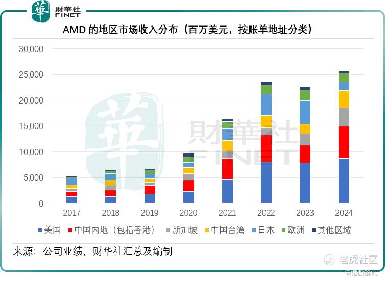 AMD在季绩中没有披露地区市场的贡献,但是从其年报的数据可以看出,中国内地是其美国之后的第二大市场,2024年,中国内地贡献收入62.31亿美元,占其总收入的24.17%,见下图。